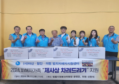 [세계타임즈]최성룡기자 = (사)마산·함안·의령 범죄피해자지원센터(이사장 윤태석)는 김종식 서무처장 주관으로 지난 2024년 9월 16일(월) 10:30 창원시 마산회원구에 있는 제사 114 업체에서 관내 거주하는 범죄피해자 4가정 및 범피위원 9명이 참석하여 “추석명절 범죄피해자 제사상 차려드리기-제수용품 ·음식 전달 행사”를 개최하였다.