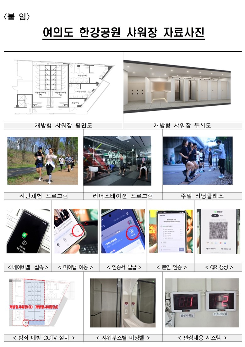 서울시는 여의도한강공원 안내센터 1층에 ‘개방형 샤워장’을 조성하고 운영에 들어간다고 4일(일) 밝혔다. 샤워장은 ‘네이버 QR출입기록 관리’로 스마트폰 QR 인증을 통해 출입 가능하며, 매일 오전 6시 30분~22시 이용(청소 시간 16~17시)할 수 있다.