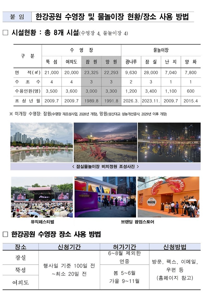 이처럼 시민 누구나 사계절 내내 한강공원 수영장을 즐길 수 있도록 돕고자 서울시는 「한강공원 장소사용 지침」에 의거, 시민의 안전과 시설 보호를 최우선으로 삼는다.