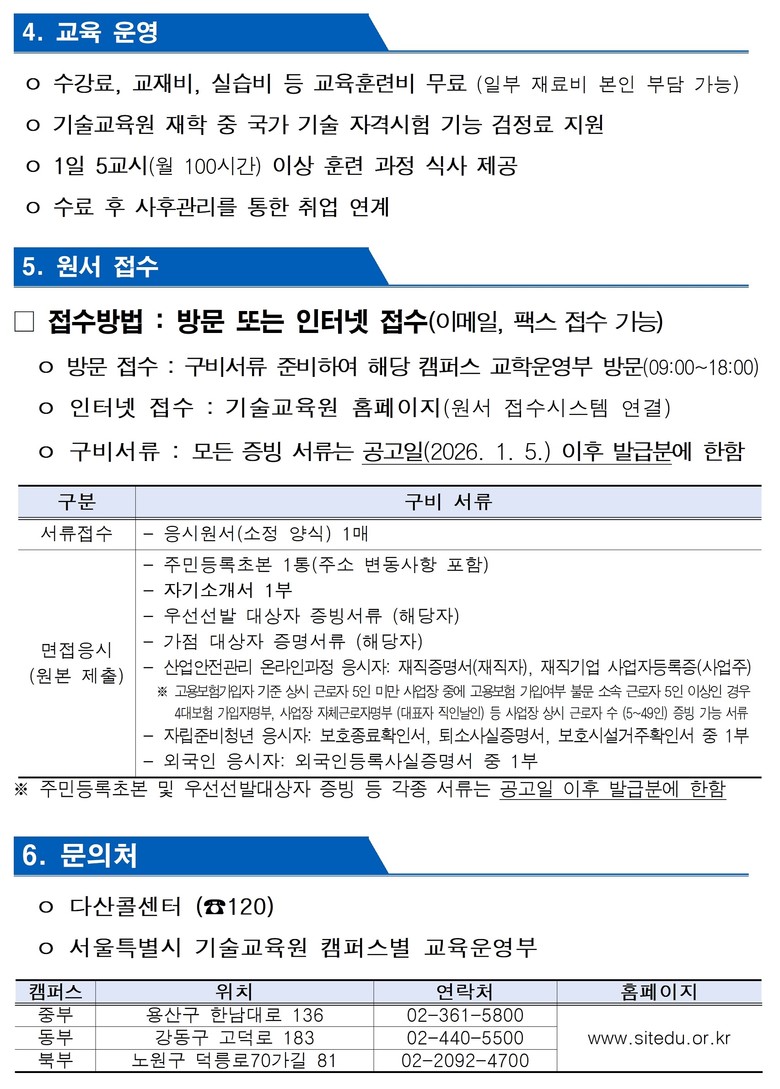 지원자는 구비서류를 갖춰 각 캠퍼스에 직접 방문하거나 기술교육원 누리집(sitedu.or.kr)을 통해 온라인 접수하면 된다. 자세한 모집 내용은 각 캠퍼스 또는 120 다산콜센터에서 확인할 수 있다.