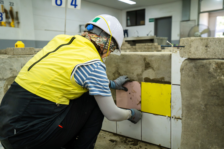 | ▲ 서울시 기술교육원 훈련생이 타일 시공 마감 실습을 진행하고 있다. |