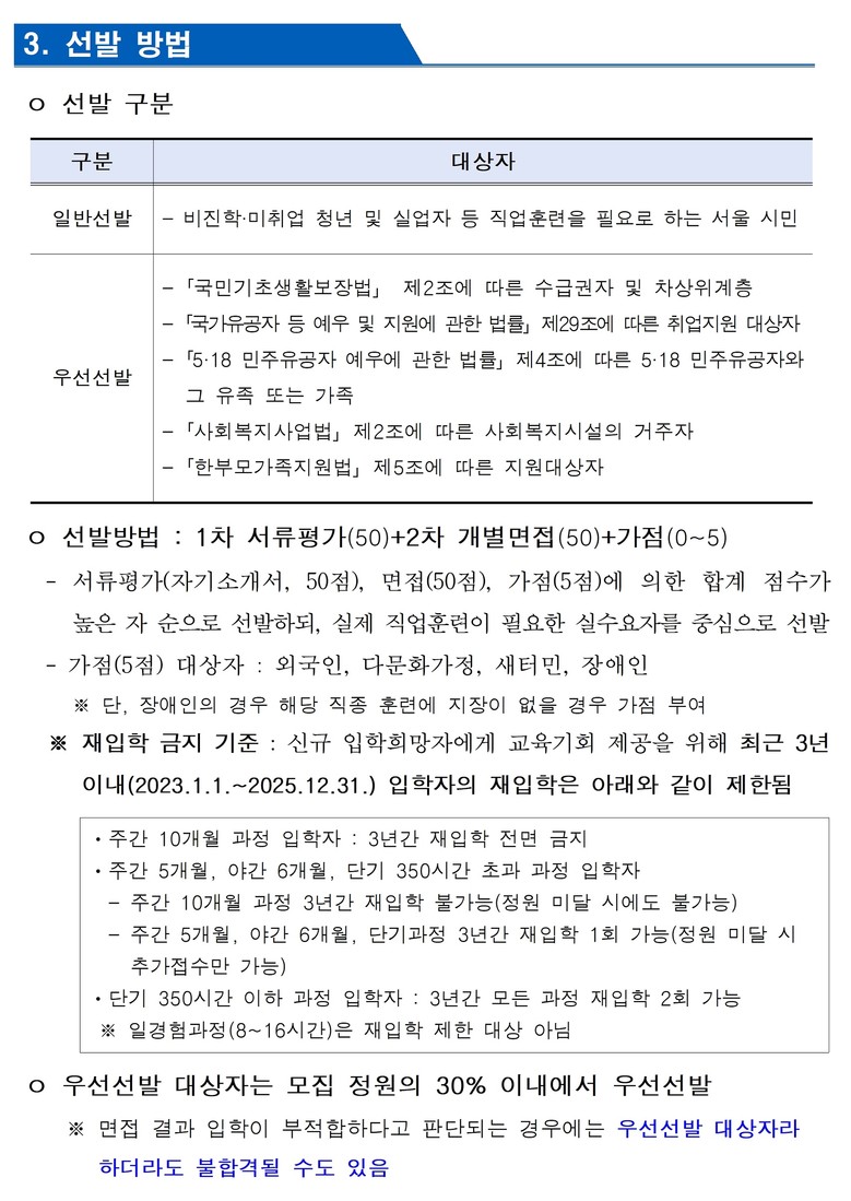 훈련생은 1차 서류전형(50점)과 2차 개별면접(50점)을 거쳐 최종 확정된다. 지원동기, 훈련 의욕, 학과 적합성 등을 종합적으로 고려해 실제 직업훈련이 필요한 실수요자를 중심으로 선발할 예정이다.