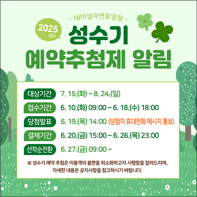 이번 추첨제는 여름철 높은 수요로 인한 예약 과열을 방지하고, 공정한 이용 기회를 제공하기 위해 마련됐다. 대상 기간은 7월 15일부터 8월 24일까지로, 예약 신청은 6월 10일 오전 9시부터 6월 18일 오후 6시까지 산림청 통합예약시스템 ‘숲나들e’(www.foresttrip.go.kr)를 통해 접수 받는다.