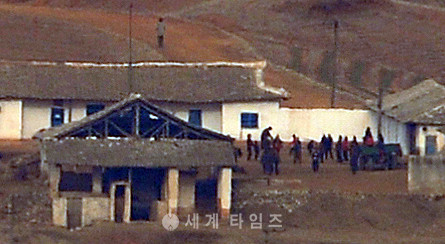 김정은 북한 조선노동당 위원장 생일인 8일 오전 경기 파주시 오두산 통일전망대에서 바라본 북한 황해북도 개풍군의 한 탈곡장에서 주민들이 바삐 움직이고 있다. 2017.01.08.