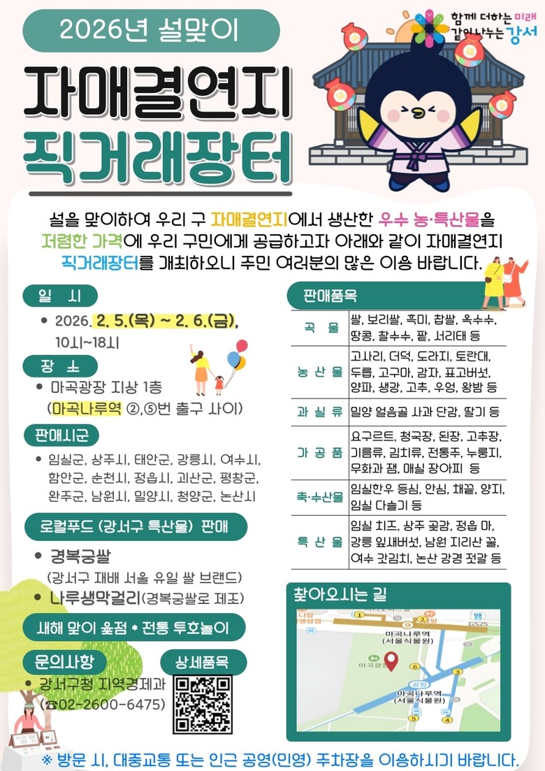 설맞이 윷점, 투호 놀이 등 전통 체험과 새해 복 기원 이벤트 풍성 [강서구 세계타임즈=이장성 기자] 서울 강서구(구청장 진교훈)가 오는 5일부터 6일까지 이틀간 ‘설맞이 직거래장터’를 운영한다고 밝혔다.