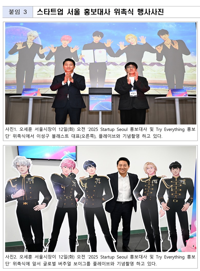 앞서 시는 서울 창업생태계의 글로벌 홍보와 청년 창업문화 확산을 위해, 대세 버추얼 아이돌 그룹 플레이브를 지난 8월 ‘스타트업 서울 홍보대사’ 1호로 위촉한 바 있다.