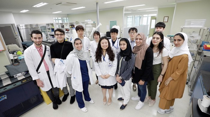 | ▲두바이 MBRU 의대생들이 자생한방병원 척추관절연구소에서 관계자들과 사진 촬영을 하고 있다. |