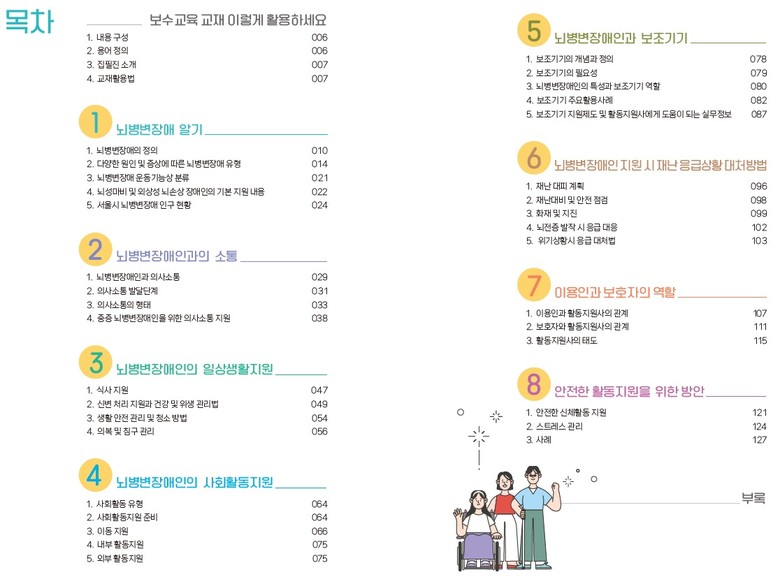 활동지원사 보수교육 교재 –뇌병변장애인- 편은 업무 수행 시 쉽게 검색하고 활용할 수 있도록 책자와 함께 e-book 형태를 제작하여 누구나 열람할 수 있도록 하였다.