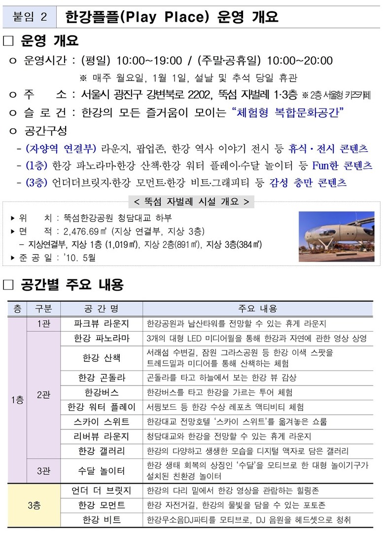 한강플플은 평일 오전 10시부터 오후 7시, 주말 및 공휴일은 오전 10시부터 오후 8시까지 운영하며, 매주 월요일은 휴관이다. 지하철 7호선 자양역과 직접 연결되어 있어 편리하게 방문할 수 있다. 자세한 위치 및 이용 안내는 한강플플 누리집(www.j-bug.co.kr) 또는 공식 인스타그램(@hangang_playplace)을 통해 확인할 수 있다.