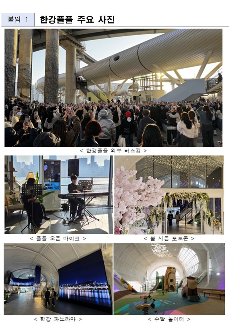 한강플플은 개장 이후 상설 프로그램과 시즌별 행사를 병행 운영하며 지속적인 방문 수요를 이끌고 있다. 주말에는 시민 참여형 버스킹 프로그램 ‘플플 오픈 마이크’가 정기적으로 운영되고 있다. 3층에서는 ‘컬러링 테이블’, ‘가족·연애고사’ 등 누구나 자유롭게 참여할 수 있는 체험형 콘텐츠가 상시 제공된다.