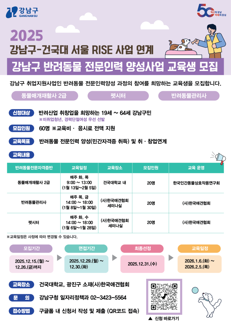 조성명 강남구청장은 “반려동물 산업은 지속 성장 중이며, 이에 따른 전문 인력 수요도 꾸준히 증가하고 있다”며 “앞으로도 민간기관과 협력해 미래직업 중심의 주민 역량 강화 사업을 지속적으로 발굴하고, 실질적 일자리 창출로 이어지도록 맞춤형 지원 체계를 확대하겠다”고 밝혔다.