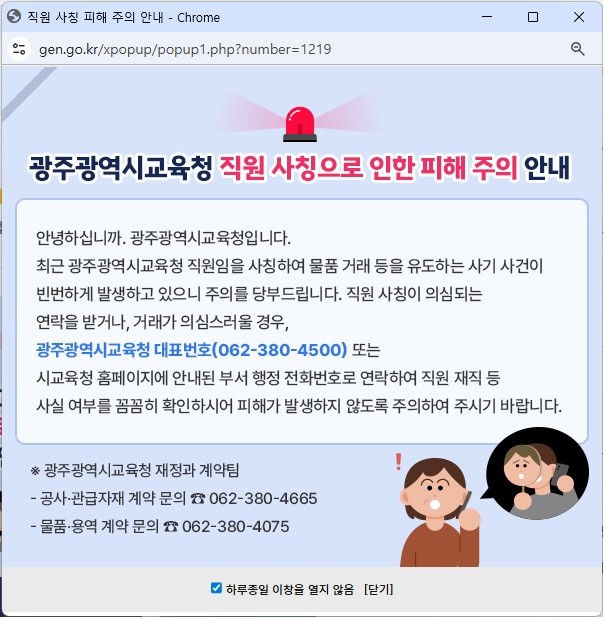 시교육청은 즉시 모든 기관과 학교에 대해 ‘공무원 사칭 주의 안내’ 공문을 발송하고, 조달청·건설협회·기계협회 등 유관기관에도 협조 공문을 보냈다. 일반 시민들도 쉽게 확인할 수 있도록 시교육청 누리집에는 팝업창을 띄워 안내하고 있다.