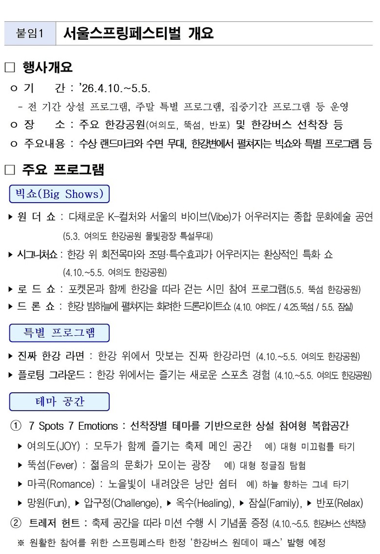 또한, 서울시는 한강 곳곳을 민간과 시민이 참여하는 축제로 만들기 위해 국내외 관광객들의 관심이 높은 패션·뷰티·엔터테인먼트·스포츠 등 다양한 주제별로 민간 협업 콘텐츠 신청을 받을 예정이다. ‘서울스프링페스티벌’ 누리집에서 자세한 정보를 확인할 수 있다.