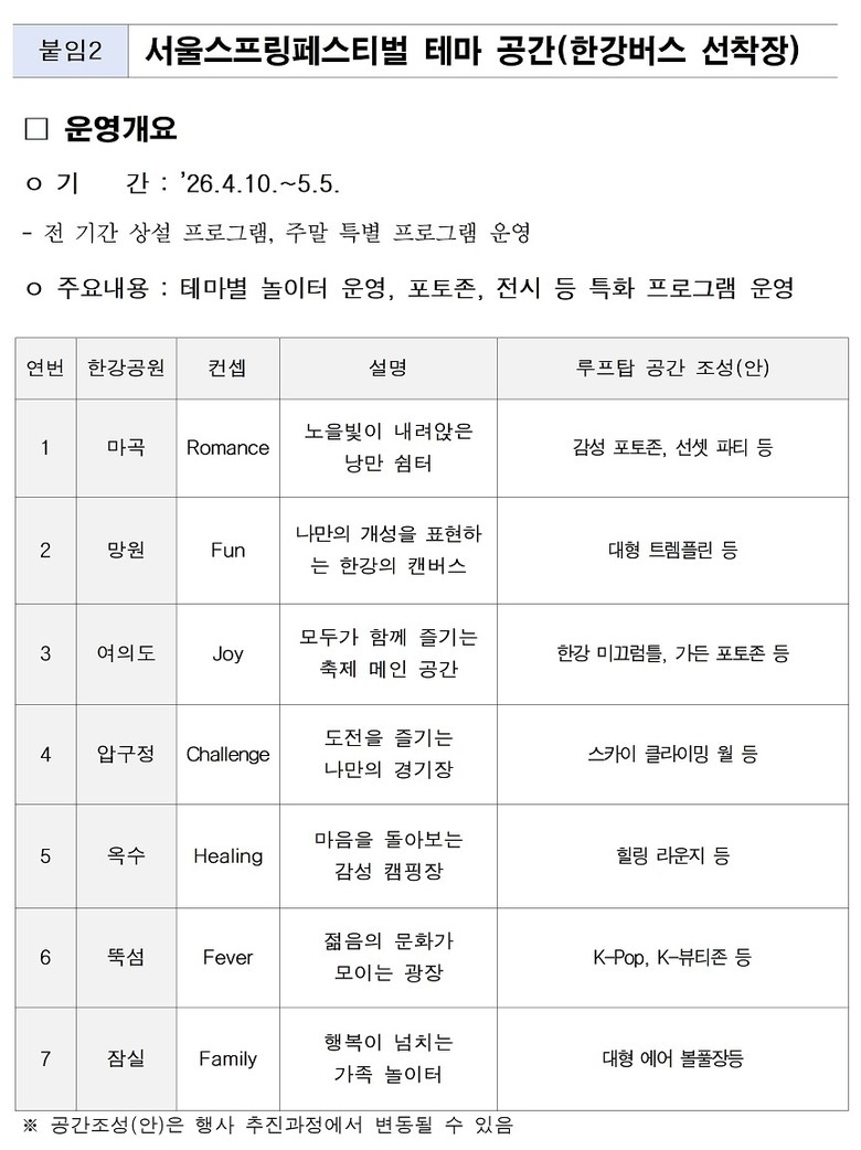 한강을 무대로 한 이번 스프링페스티벌은 한강버스를 타고 이동하면서 참여하고 체험할 수 있는 특별한 7개의 스팟을 마련하였다. 즉, 7개한강버스 선착장을 각각 낭만, 열정, 매력 등 7개의 테마별로 구성하여, 대형 클라이밍 월, 트렘플린 등 체험형 놀이터 공간을 조성하고 포토존과 전시 등 특화 프로그램도 운영한다.