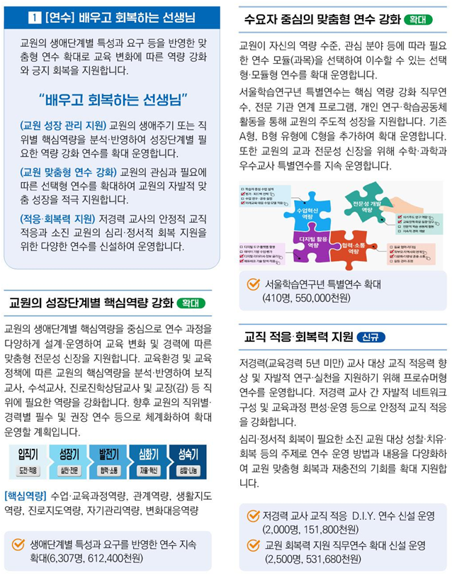 - 교원들이 자신의 역량 수준, 관심 분야에 따라 필요한 연수 과정 및 모듈을 선택하여 이수할 수 있는 ▲수요자 선택형‧맞춤형 직무연수, 자기주도적 역량 개발을 지원하는 ▲서울학습연구년 특별연수 ▲수학‧과학 우수교사 특별연수 등을 확대‧강화한다.