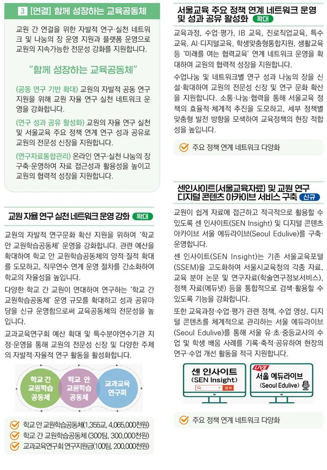- ▲학교 안·학교 간 교원학습공동체 ▲교과교육연구회 등 교원의 자율적·실천적 연구 네트워크 운영을 강화한다.