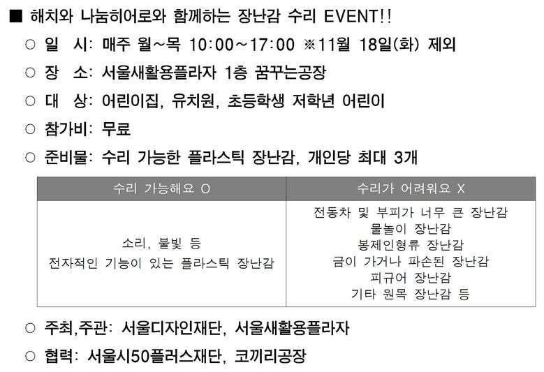 이어서 서울새활용플라자에서는 11월 22일(토)과 29일(토)에 장난감 기부데이를 연다. 기부된 장난감은 세척·분류 과정을 거쳐 필요한 가정 또는 아동복지시설 등으로 전달될 예정이다. 어린이 기부자에게는 감사장과 함께 새활용 굿즈가 제공된다.