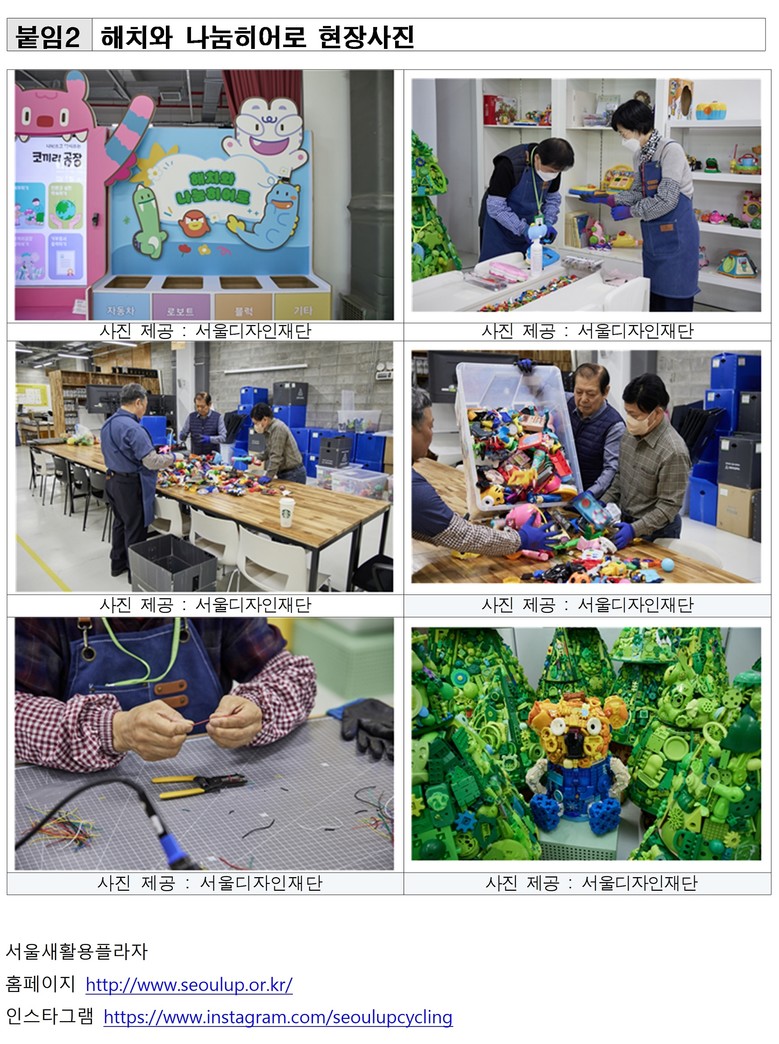 장난감 자원순환 프로젝트는 쓰지 않는 장난감을 기부받아 세척·분류·수리하여 나눔으로 연결하는 ‘서울형 순환경제 모델’이다. 올해 초 서울시50+재단, 서울여성가족재단과 MOU를 체결하고, 사회적기업 코끼리공장과 함께 지난 7월부터 서울새활용플라자에서 ‘해치와 나눔히어로’를 운영해 오고 있다.