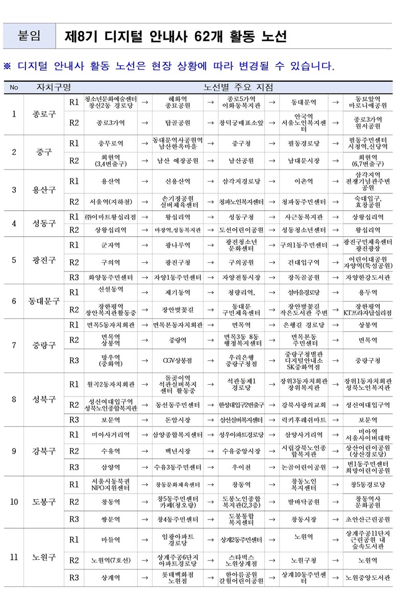 활동 거점은 지하철역, 복지시설, 공원 등 디지털 접근 수요가 높은 생활공간을 중심으로 자치구별 2~3개씩, 총 62개 노선을 설계해 시민 접점을 높였다.
