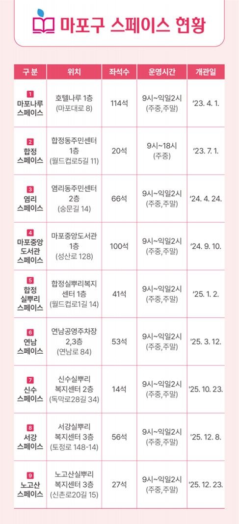 ‘스페이스’는 마포구가 청소년을 위해 조성한 학습 공간으로, 현재는 총 9개소가 운영되고 있다.