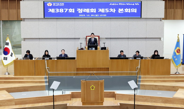 경기도의회는 이날 제387회 정례회 5차 본회의를 열고 2026년도 새해 예산안을 의결하며 회기 일정을 끝마쳤다.