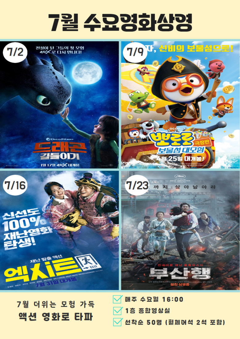 먼저 7월 2일에는 「드래곤 길들이기1」이 상영된다. 용과 인간이 서로 이해하고 교감하는 과정을 그린 이 만화영화(애니메이션)는 모든 연령대의 관객들에게 꿈과 희망을 전달하는 알림(메시지)을 담았다.