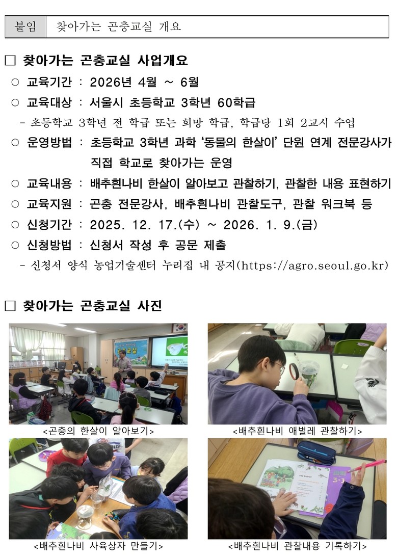 교육은 학급당 1회, 총 2교시로 운영되며, 수업에 필요한 배추흰나비 관찰 도구와 관찰 기록장 등은 모두 무상으로 제공된다. 특히 곤충 전문 강사가 직접 학교를 방문해 학생 눈높이에 맞춘 설명과 활동을 진행함으로써, 교실 수업만으로는 경험하기 어려운 생생한 관찰 활동을 제공할 예정이다.