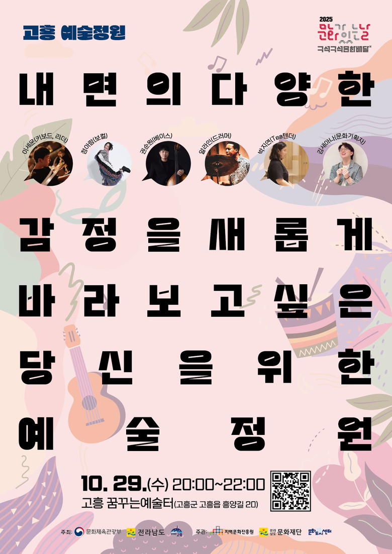 이번 ‘고흥예술정원’은 이세운 밴드와 김새아나 문화기획자가 함께하며, ‘내면의 다양한 감정을 새롭게 바라보고 싶은 당신을 위한 예술정원’을 주제로 감정 키워드를 활용한 재즈 즉흥 연주 워크숍이 진행될 예정이다.