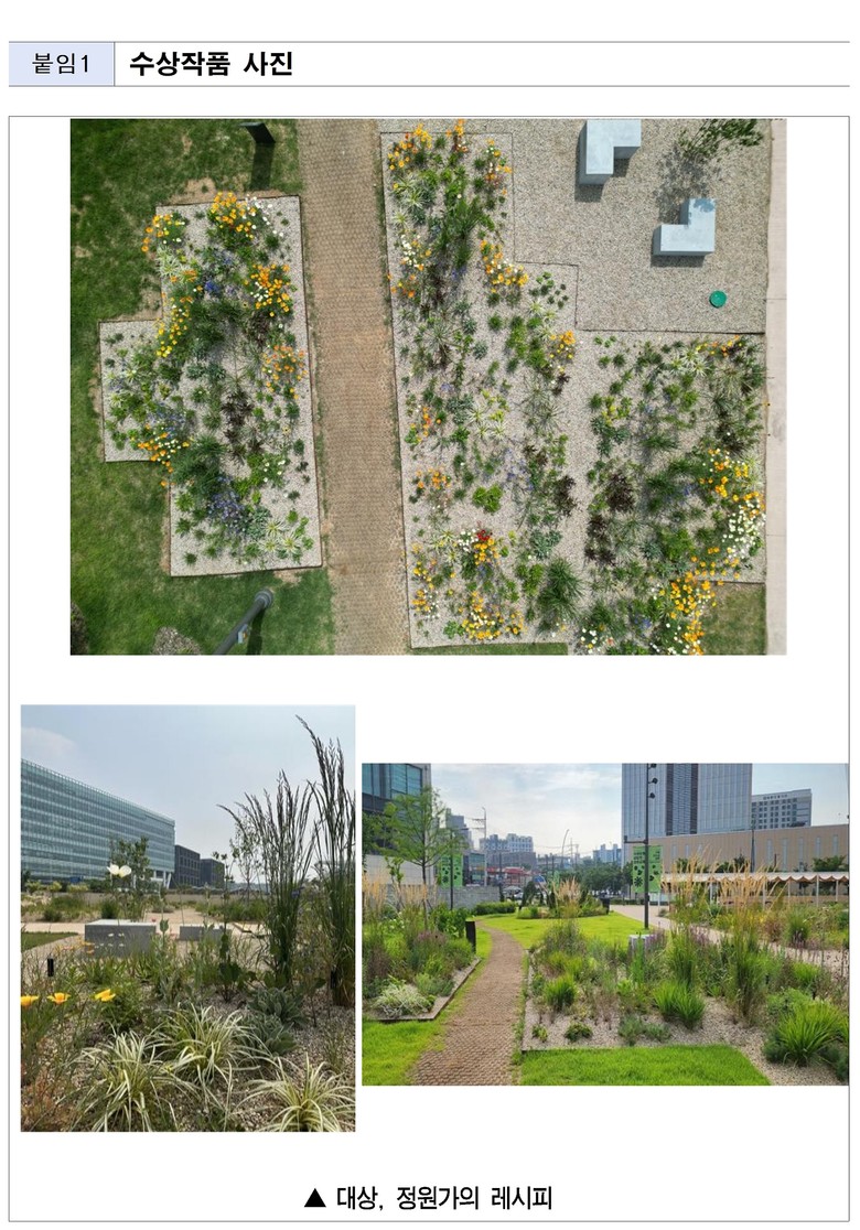 대상을 수상한 ‘정원가의 레시피’는 회복력이 강한 식물을 중심으로 자연의 다양성을 활용해 변화하는 기후에도 안정적으로 대응할 수 있는 정원으로 조성됐다. 특히 폭염과 폭우 등 이상기후에도 사계절 유지가 가능한 식재 조합을 적용해, 봄부터 겨울까지 건강하게 생육할 수 있는 점이 높은 평가를 받았다. 또한 유지관리 부담을 최소화하면서도 장기적으로 안정적인 경관을 유지할 수 있는 설계로 우수성이 인정됐다.