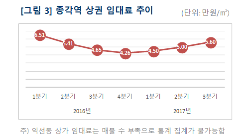한편 종각역 상권은 3분기 째 임대료 상승이 이어지고 있다. 대로변 매물 등 일부 임차인 모집이 어렵지만 임대료를 낮추지 않아 상승세가 이어지고 있다. 관철동, 종로1가 일대에서 높게는 ㎡당 10만원 수준에서 매물이 출시되고 있다.