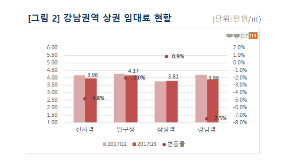 강남권역 주요 상권 임대료는 신사역(-4.8%), 압구정(-2.0%), 강남역(-7.5%)이 하락했고 삼성역은 0.9% 상승했다. 신사동 가로수길은 중국인 관광객 수요를 대상으로 하는 대기업 SPA브랜드, 코스메틱 업종이 부진을 면치 못하는 모습이다. 외교적 이슈로 관광객 방문이 뜸해지면서 매출에도 큰 타격이 짐작된다.