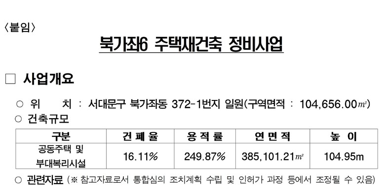 서울시는 11월 13일 제11차 정비사업 통합심의위원회를 열어 서대문구 북가좌동 372-1번지 일대 ‘북가좌6구역 주택재건축정비사업’에 대한 건축·경관·교통·교육·공원·환경·재해 7개 분야를 한번에 통합 심의하여 ‘조건부 의결’했다고 밝혔다.