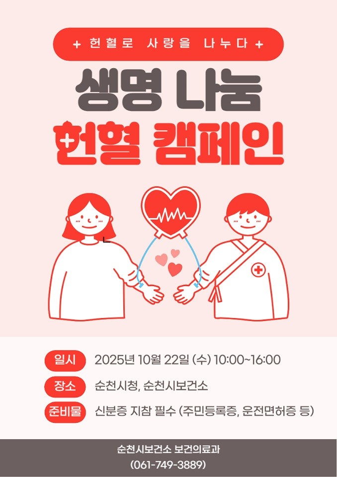 헌혈 관련 문의는 순천시 보건의료과(061-749-3889)로 하면 된다.