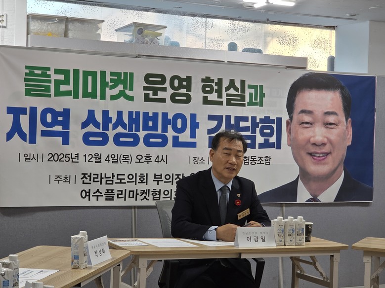 [전남 세계타임즈=우덕현 기자] 전라남도의회 이광일 부의장(더불어민주당·여수3)은 지난 12월 4일 여수시 흥국로 소재 우리노리협동조합에서 「플리마켓 운영 현실 및 지역 상생방안 간담회」를 개최하고, 플리마켓 운영 여건 개선과 제도적 지원 방안을 논의했다.