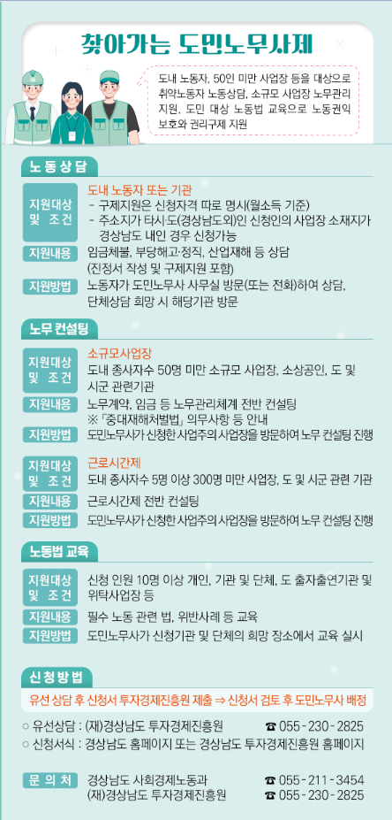 ‘찾아가는 도민노무사제’ 신청은 경남투자경제진흥원 일자리사업단(☎055-230-2825)에 전화로도 가능하며, 신청서식은 경상남도 또는 경남투자경제진흥원 누리집에서 확인할 수 있다.