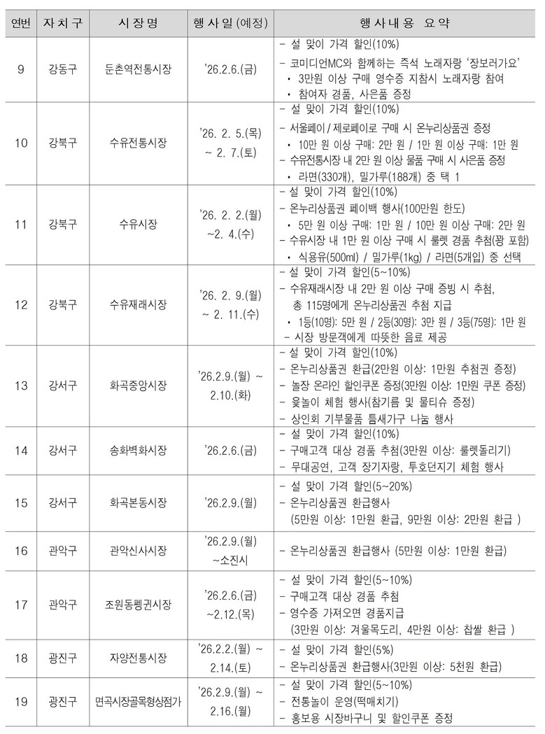 한편 시는 명절 기간 전통시장 안전사고 예방을 위해 1월 19일(월)부터 2월 6일(금)까지 서울시 내 244개 시장의 시설 점검(전기·가스·소방 등)을 진행 중이다. 또한 자치구·시장상인회와 합동으로 밀집 예상 시간대에 지원 인력을 편성·배치하고, 관내 소방서·경찰서 등과 비상 연락망을 구축해 비상 상황 발생 시 신속하게 대응할 계획이다.