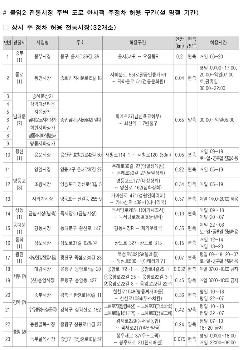 서울시는 전통시장을 찾는 시민들의 편리한 시장 이용을 위해 18일(수)까지 무료 주정차 대상 시장을 추석 대비 3개소 늘려 71개소를 운영한다. 대상 시장은 관할 경찰서별로 운영 기간과 시간이 달라, 자세한 내용은 서울시 누리집 내 ‘새소식’에서 확인할 수 있다.