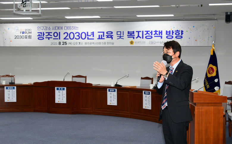 [광주 세계타임즈=손권일 기자] 광주시의회는 (사)광주마당과 공동으로 ‘인구감소 시대 광주의 2030년 교육복지 정책 방향’을 주제로 지난 25일(목) 광주시의회 5층 회의실에서 포럼을 개최했다. 2030포럼 운영위원장으로 이날 좌장을 맡은 박수기 시의원은 “통계청이 발표한 지난 2분기 합계출산율이 0.75명이라는 수치에 매우 충격적이라며 2030년 광주의 교육 및 복지정책의 전면적 전환을 준비해야 한다”고 밝혔다.
