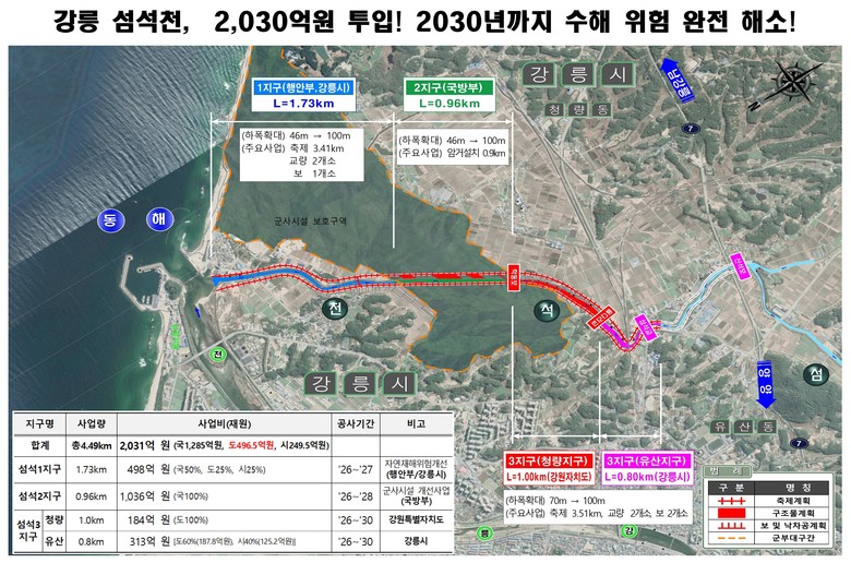 도는 지난 3년간 기관별 사업 분담과 국비 지원 등을 협의해 4개 기관이 공동 투자하기로 합의했다. 섬석1지구는 행정안전부와 강릉시가 498억 원, 섬석2지구는 국방부가 1,036억 원, 섬석3지구는 강원특별자치도와 강릉시가 497억 원을 각각 투자한다.