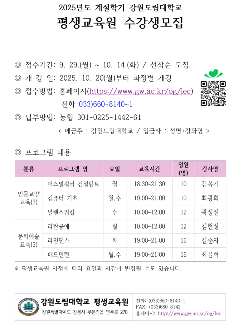 수강신청은 9월 29일부터 10월 14일까지이며, 자세한 사항은 강원도립대학교 평생교육원 홈페이지(https://www.gw.ac.kr/og/lec) 또는 전화(033-660-8141)를 통해 확인할 수 있다.