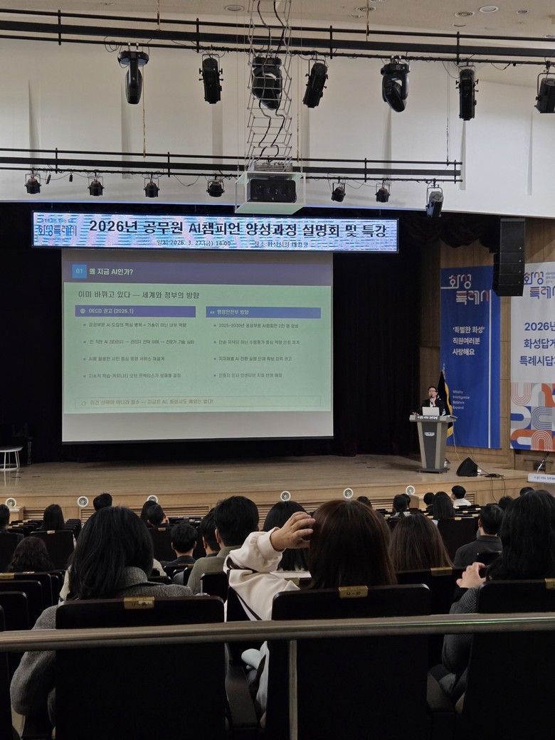 [화성시 세계타임즈=송민수 기자] 화성특례시는 27일 시청 대강당에서 공공부문 AI 행정 혁신을 선도할 핵심 인재 양성을 위해 ‘공무원 AI 챔피언 교육과정 설명회’를 열었다. 이번 설명회는 공무원들이 AI와 데이터를 활용해 실제 행정 문제를 해결하는 ‘AI 챔피언’으로 거듭나 조직 전반의 업무 처리 방식을 혁신하고자 마련됐다.