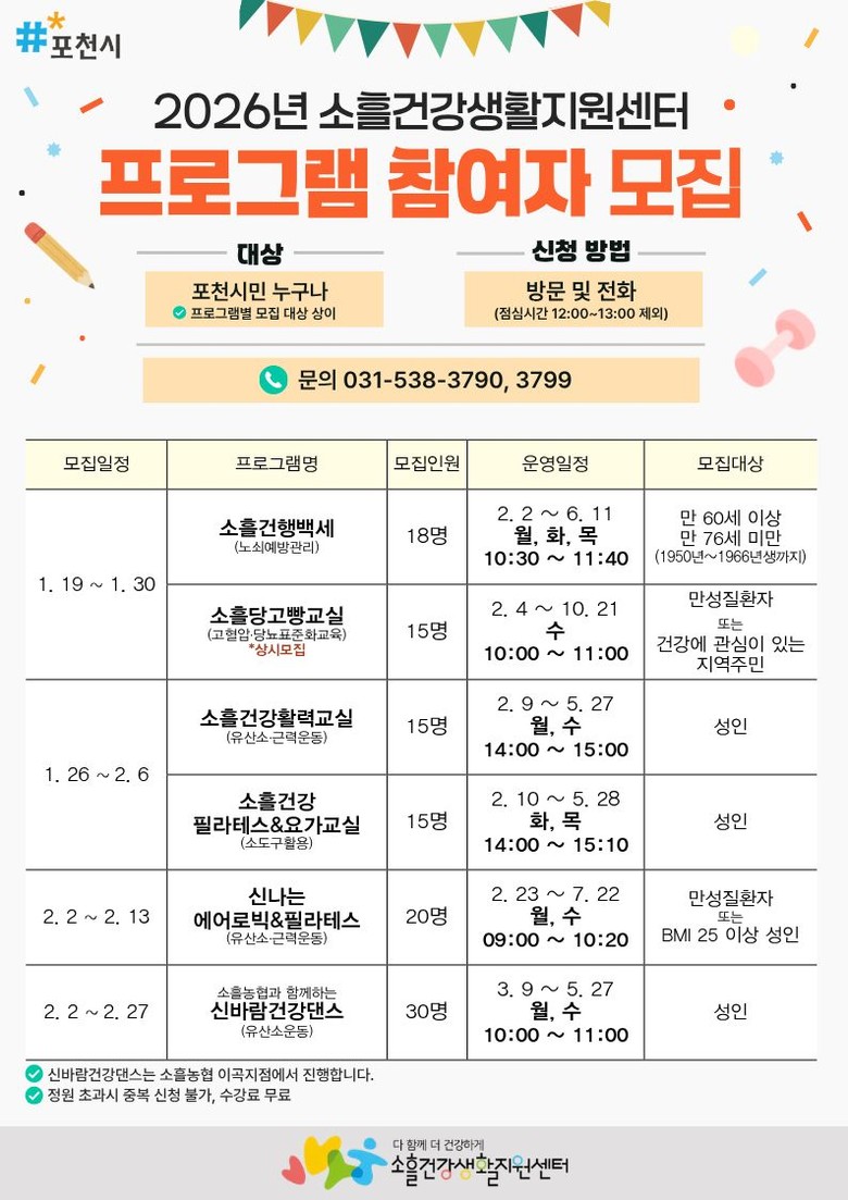 프로그램별 세부 일정과 교육 내용은 안내 포스터를 참고하거나 소흘건강생활지원센터(☎ 031-538-3790, 3799)로 문의하면 된다.