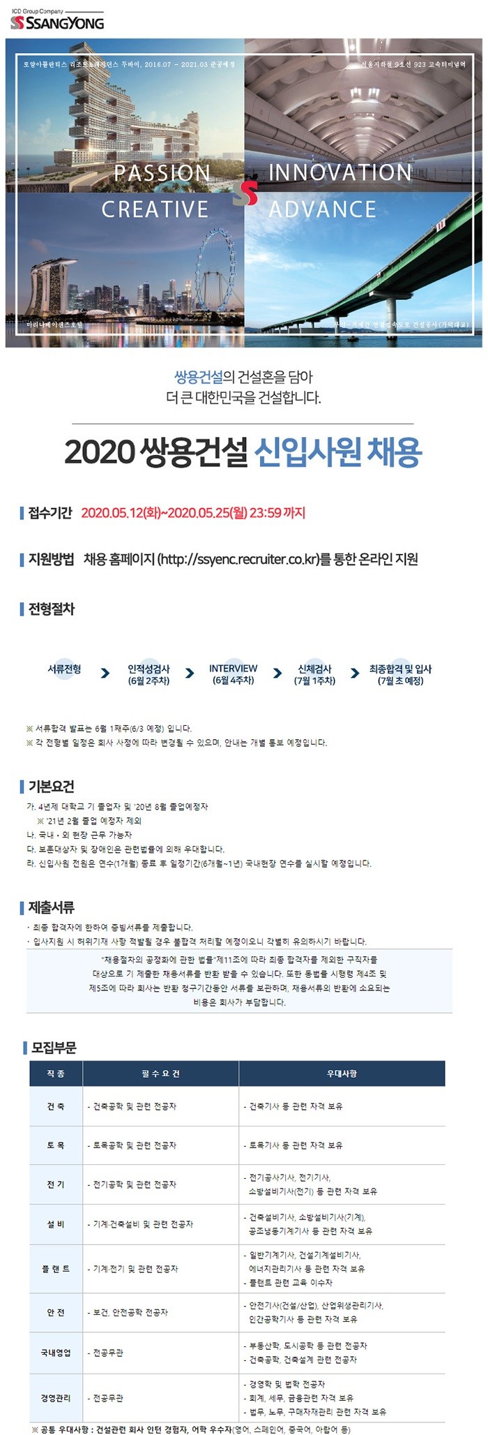 [세계타임즈 심귀영 기자] 쌍용건설(대표이사 회장 김석준)이 코로나 19 사태로 경기와 고용시장이 침체된 상황에서도 글로벌 건설명가의 주역으로 성장할 신입사원 약 30명을 채용에 나선다.