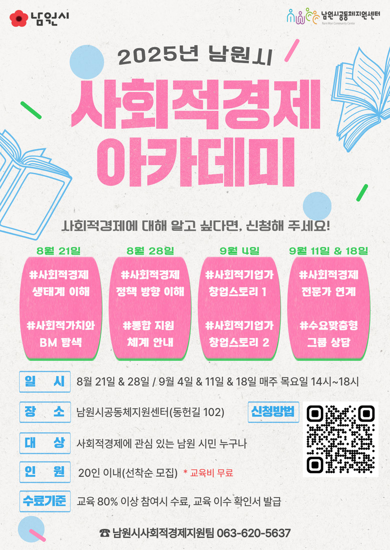 교육 일정은 8월 21일부터 9월 18일까지 총 5회 (매주 목요일 14시~18시) 남원시공동체지원센터에서 진행되며 교육비는 무료이다. 모집인원은 총 30명 이내로 교육 수료생에게는 이수증이 발급되고 전 과정의 80% 이상 참석할 경우 2026년 예비사회적기업 지정 공모 시 사전 교육 실적으로 인정되는 혜택도 주어진다.