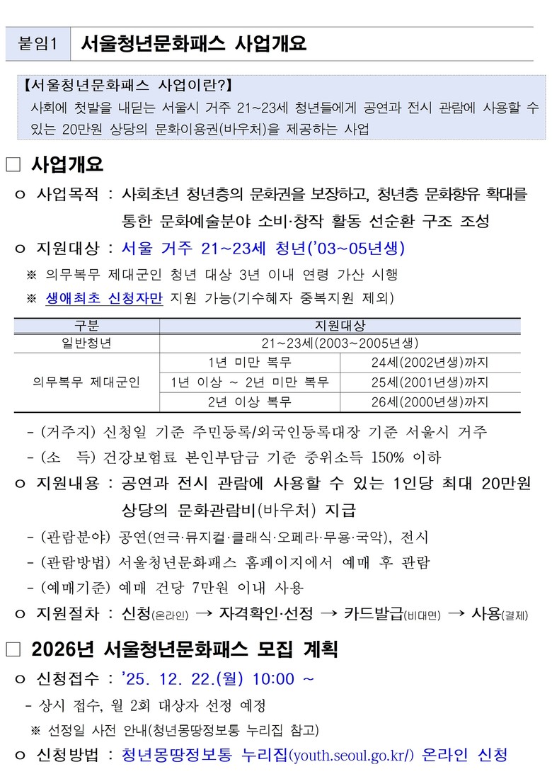 2026년 서울청년문화패스는 2003년~2005년에 태어난 서울 거주 청년 중 가구 기준 중위소득 150% 이하인 청년이 혜택을 받을 수 있다.
