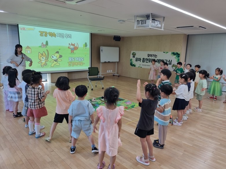 교육은 유아의 눈높이에 맞춘 놀이형 콘텐츠로 구성돼, 참여한 기관과 아동들로부터 큰 호응을 얻었다. 주요 프로그램으로는 ‘노담밴드, 노스모킹별을 지켜줘’ 이야기를 활용한 동화 구연, OX 퀴즈, 동요 및 율동 활동 등이 진행됐으며, 다양한 시청각 자료와 체험 요소를 통해 흡연의 해로움을 쉽고 재미있게 전달했다.