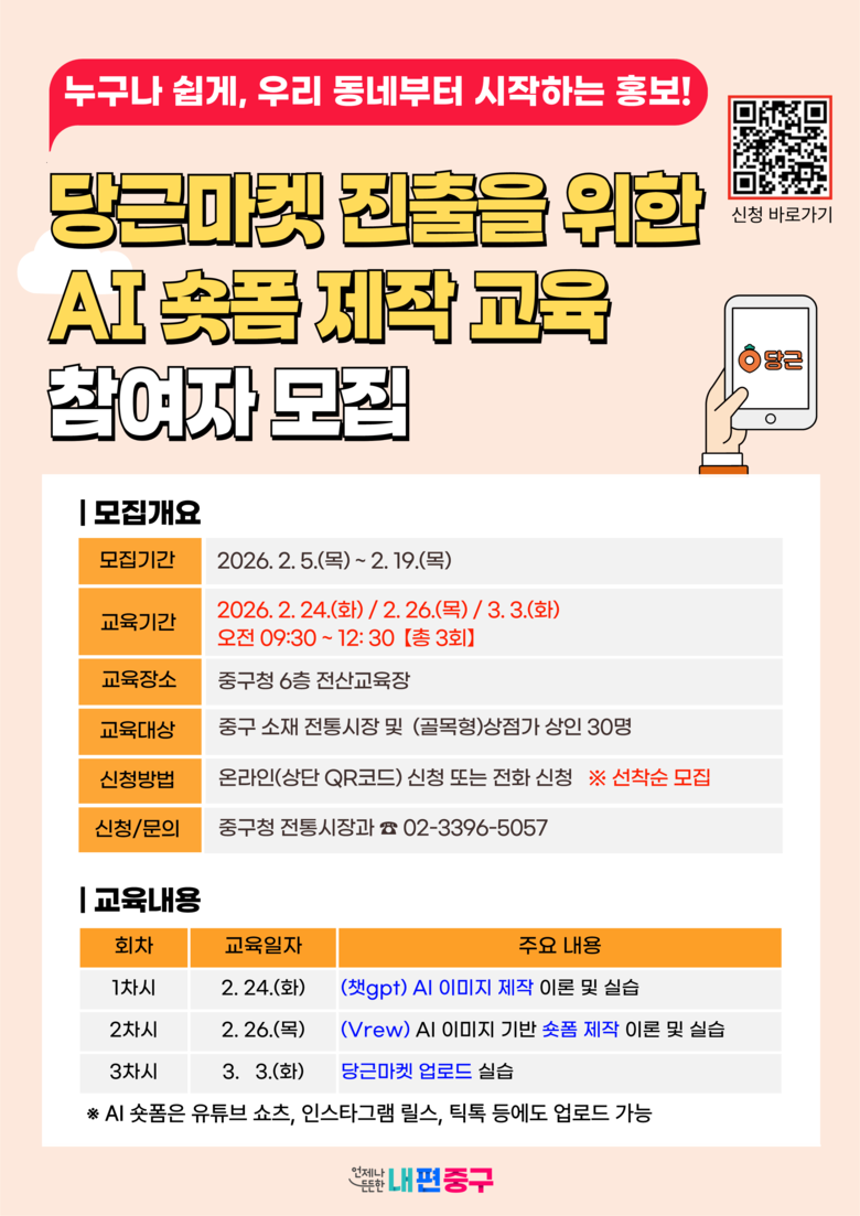 교육은 2월 24일부터 3월 3일까지 총 3회 과정으로 진행한다. 1회차에서는 ChatGPT를 활용한 AI 이미지 제작, 2회차에서는 Vrew를 활용한 숏폼 영상 제작, 3회차에서는 당근마켓 콘텐츠 업로드 실습을 다룬다.