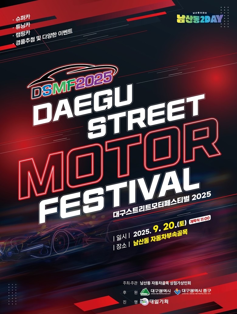 ▸ 차량시승·경품 추첨·가족체험존 등 풍성한 즐길거리 가득 [세계타임즈=대구 한윤석 기자] 대구의 대표 자동차 골목 축제 ‘2025 대구스트리트모터페스티벌’이 올해로 14회를 맞아 오는 9월 20일(토), 중구 남산동 자동차 부속골목에서 개최된다.