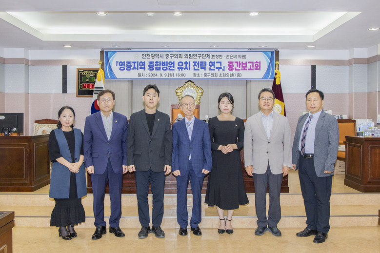 연구단체 한창한 대표의원은 “이번 중간보고회를 통해서 영종지역 종합병원 유치 가능성과 확신이 더욱 높아지는 계기가 되었다”며 “성공적인 연구결과를 이끌어 내기 위해 최종 결과보고회까지 적극적으로 연구활동에 임하겠다”고 포부를 밝혔다.