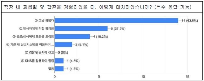 특히 ‘직장 내 괴롭힘’ 문제가 핵심 리스크로 지적되었다. 최근 1년간 직장 내 괴롭힘을 직·간접적으로 경험한 비율이 21.2%에 달했고, 가해자는 팀원 등 동료가 50%로 가장 많았다. 무엇보다 피해자 64%가 “그냥 참는다”고 응답했고, 별도 구제절차는 여전히 마련되지 않은 실정으로 실효성 있는 제도 개선이 시급한 상황이다.